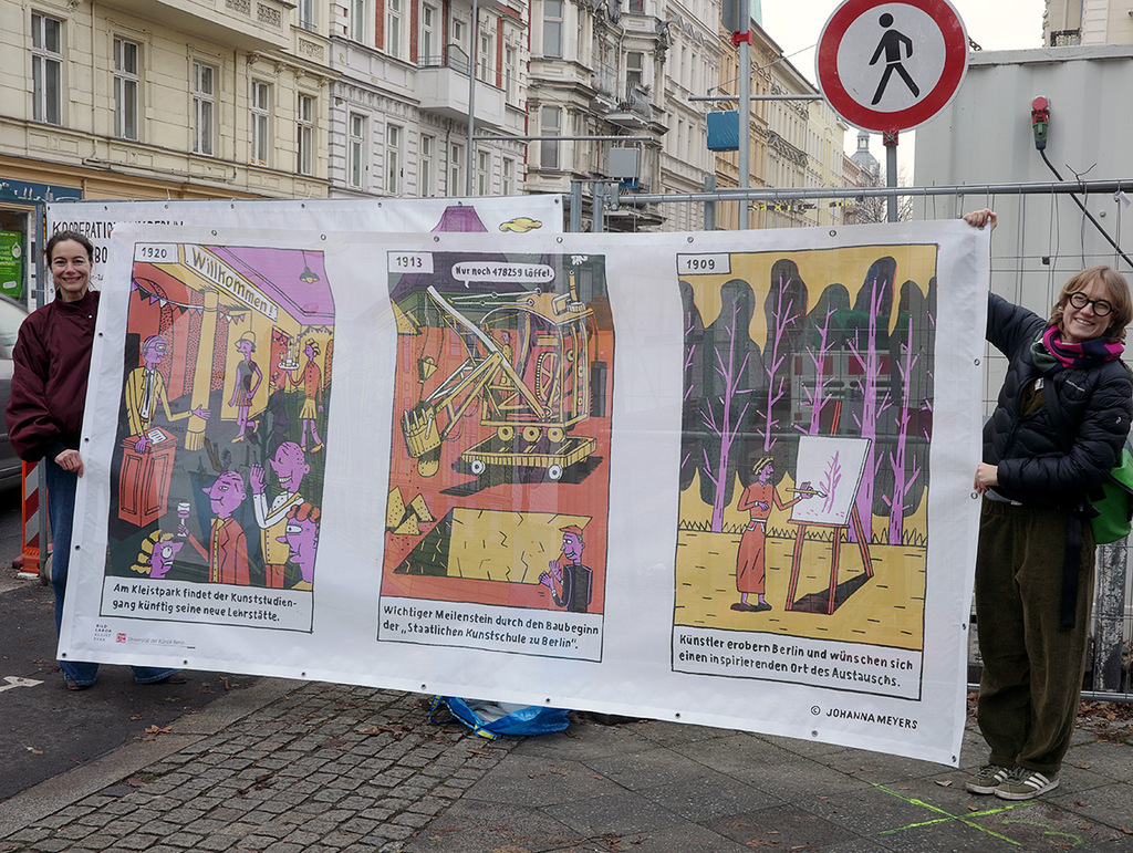Großer Andrang herrschte am 12. Januar 2025 auf dem Baugrundstück, wo Anwohner, Familien mit Kindern sowie Vertreter des Bezirks und der umliegenden Institutionen mit den Initiatoren ins Gespräch kamen. Unter freiem Himmel wurde bei frischen Quarkbällchen und Punsch ausgiebig über Kunst und über den Neubau am Kleistpark diskutiert.